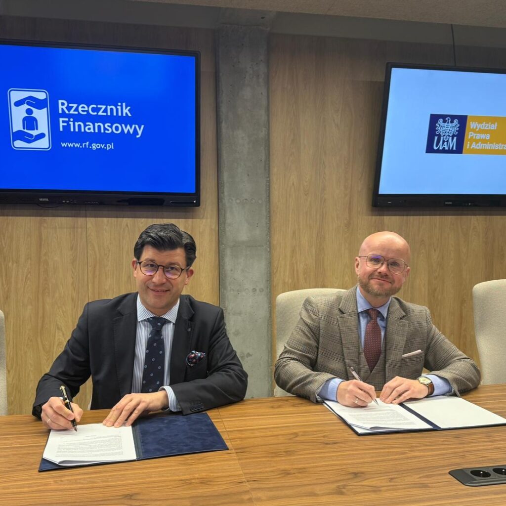 Rzecznik Finansowy dr Michał Ziemiak oraz prof. dr hab. Tomasz Nieborak, dziekan Wydziału Prawa i Administracji Uniwersytetu im. Adama Mickiewicza w Poznaniu podpisali porozumienie o współpracy. Zakłada ono szeroką współpracę na rzecz zwiększania świadomości finansowej. Chodzi m.in. o badania nad funkcjonowaniem rynku finansowego oraz wykorzystaniem innowacyjnych technologii i występowaniem w tych obszarach możliwych zagrożeń dla konsumentów usług finansowych.
