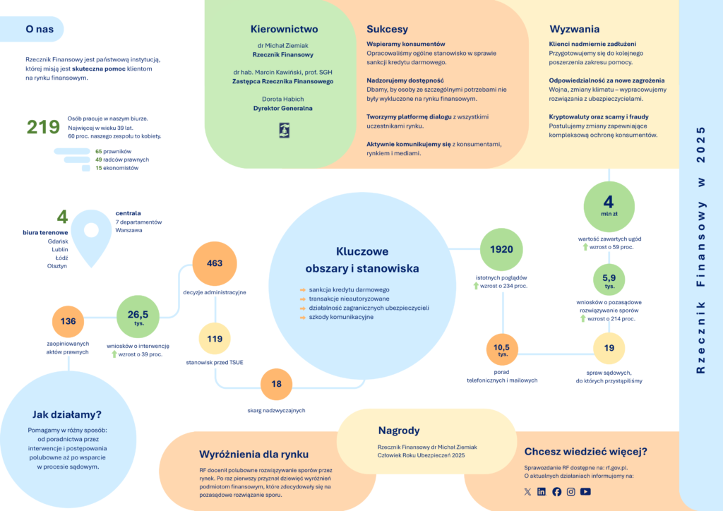 Sprawozdanie z działalności Rzecznika Finansowego w 2025 roku dostępne w sekcji Sprawozdania z działalności Rzecznika Finansowego, pod poniższymi linkami: